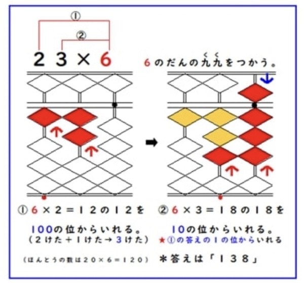 九九に「が」がついたら、つまり九九の答えが1けたのときは、指を1けた右にずらして、答えを入れる。