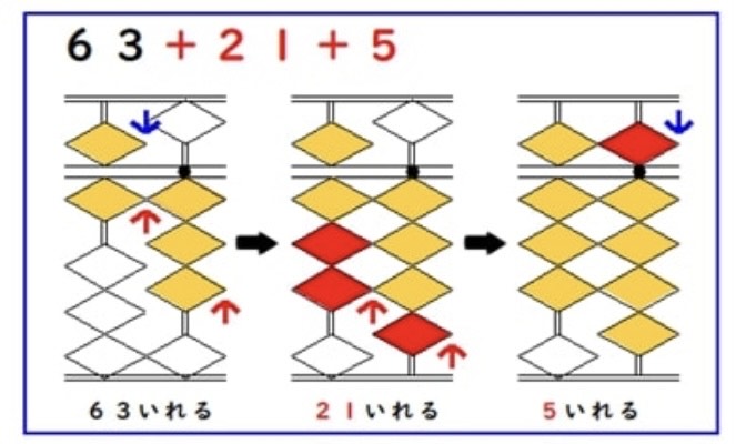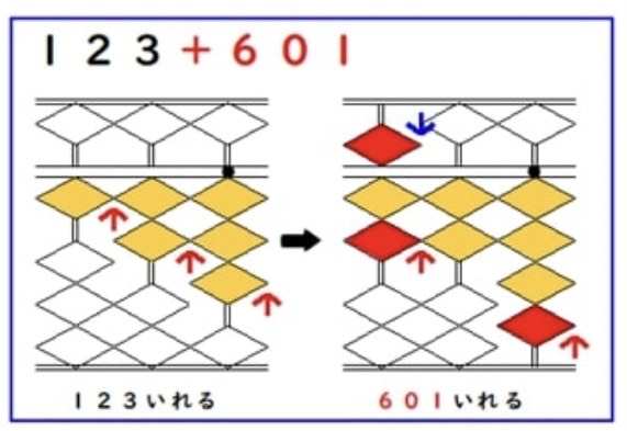 ②百の位に、6(1玉を1個と5玉)を入れて、一の位に1玉を1個入れる。